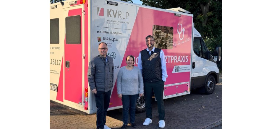 Auf dem Bild zu sehen: Bürgermeister Jens Güllering, die Ärztin der Mobilen Arztpraxis sowie Stadtbürgermeister Marco Ludwig (von links) am Standort Bürgerhaus Nastätten.
