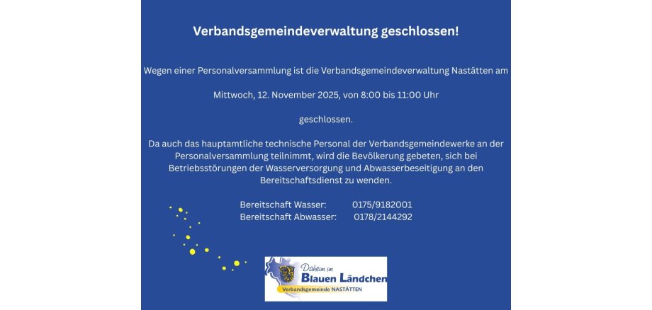 Da auch das hauptamtliche technische Personal der Verbandsgemeindewerke an der Personalversammlung teilnimmt, wird die Bevölkerung gebeten, sich bei Betriebsstörungen der Wasserversorgung und Abwasserbeseitigung an den Bereitschaftsdienst zu wenden.